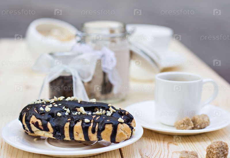 Шоколадный эклер с чашкой кофе