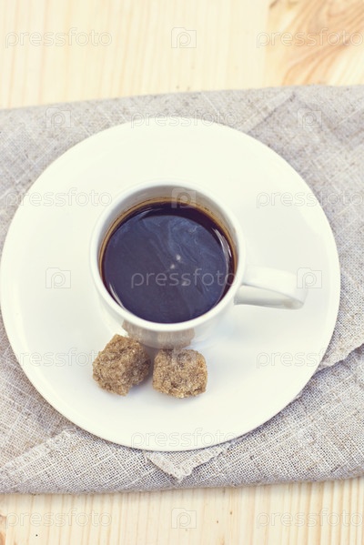 Чашка кофе «эспрессо» и несколько кусочков коричневого сахара