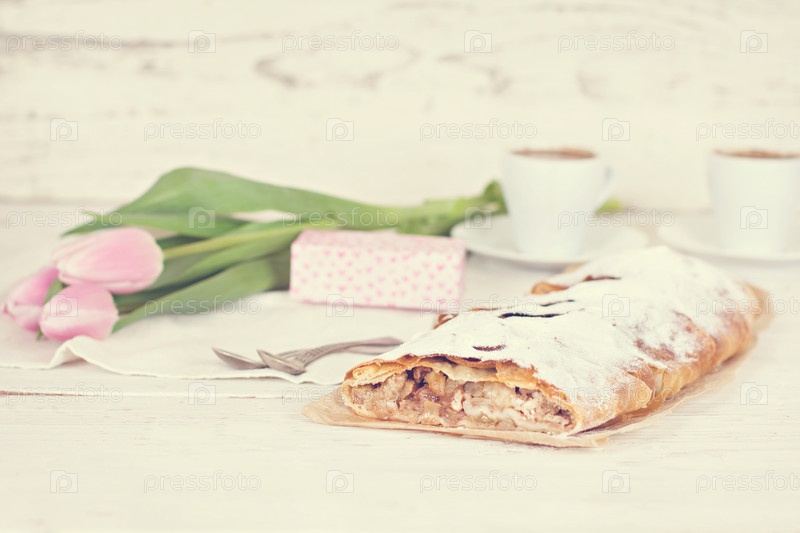 Пирог и весеннее украшение на белом фоне