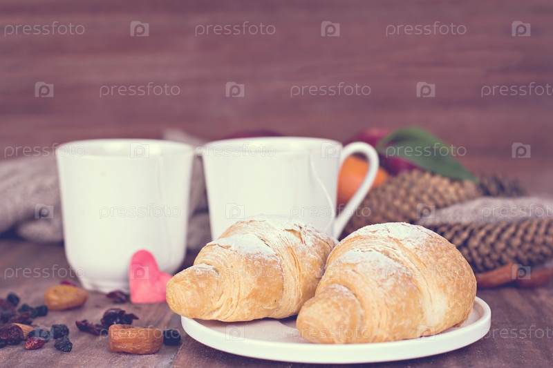 Две чашки чая и круассаны в романтической обстановке