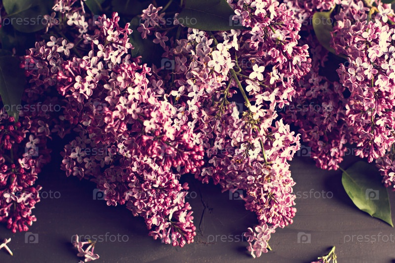 Красивые сиреневые цветы на темном деревянном фоне