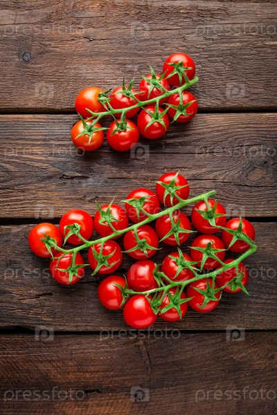 Свежие помидоры черри на веточках на деревянном столе