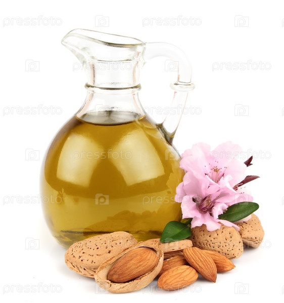 Миндальное масло и миндаль с цветами на белом фоне