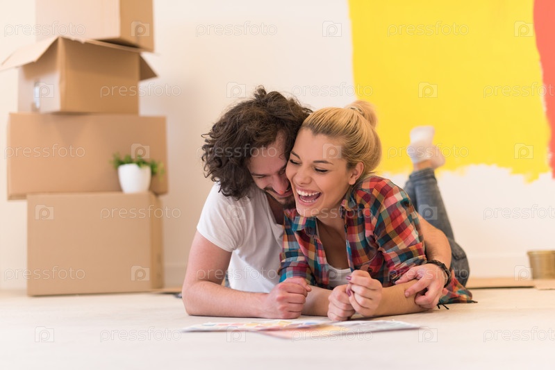 Счастливая молодая пара в новой квартире