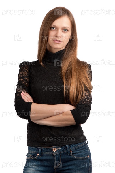 Красивая девушка с длинными волосами в черной блузке и джинсах стоит на белом фоне