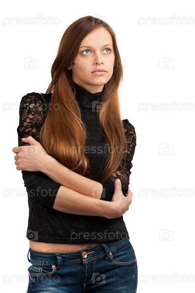 Красивая девушка с длинными волосами в черной блузке и джинсах стоит на белом фоне