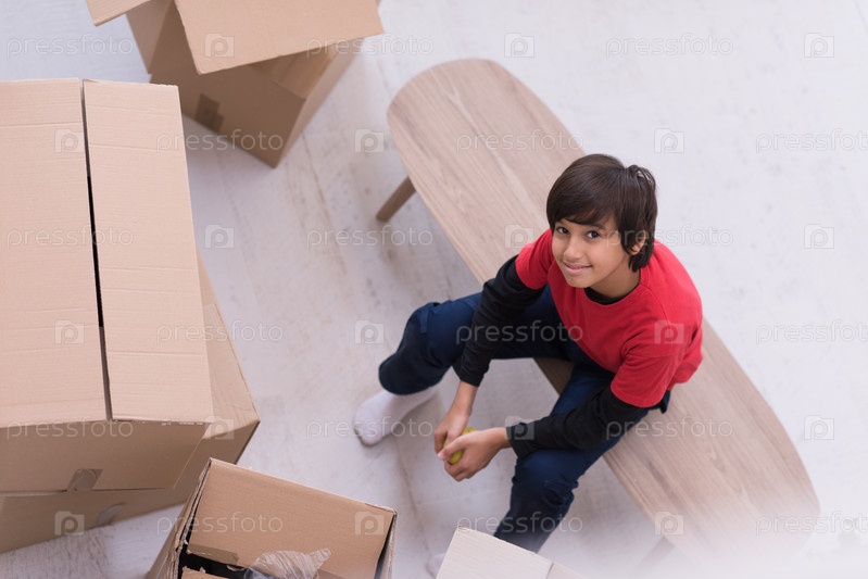 Мальчик сидит на столе с картонными коробками вокруг него
