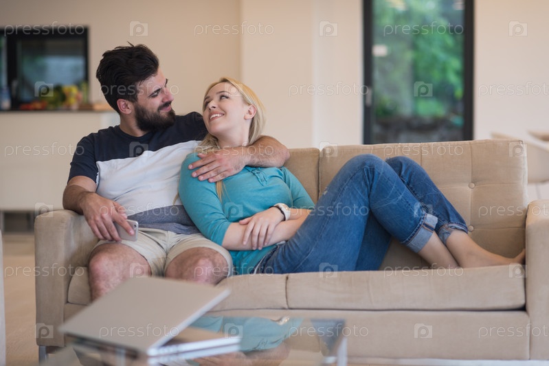 Молодая счастливая пара расслабляется в гостиной