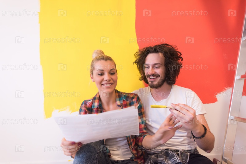 Счастливая молодая пара расслабляется после живописи