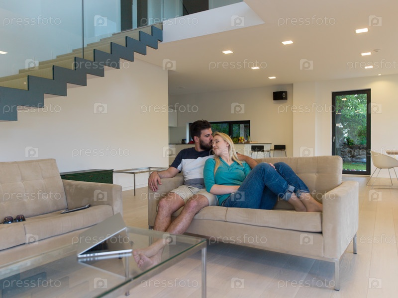 Молодая счастливая пара расслабляется в гостиной
