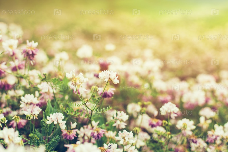 Весеннее поле с дикими цветами на рассвете