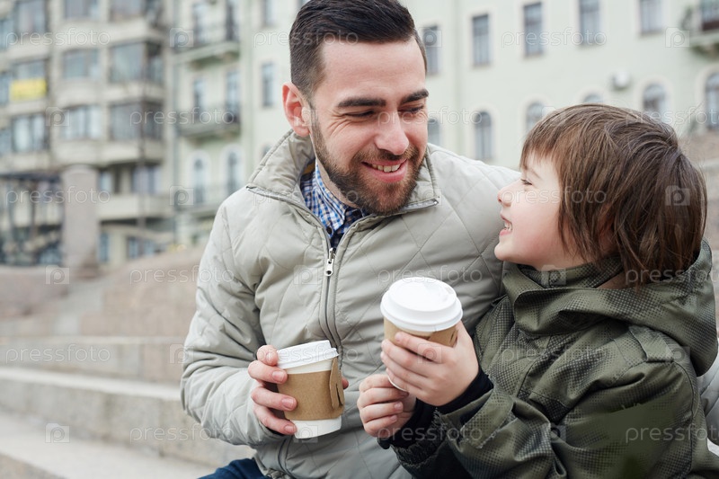 Отец и сын пьют кофе
