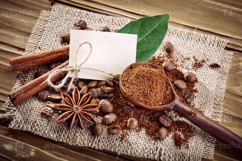 Кофе в зернах, молотый кофе и корица на мешковине