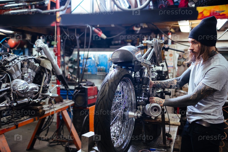 Татуированный механик, собирающий мотоцикл в гараже