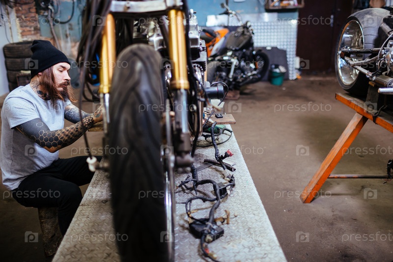 Татуированный байкер, работающий в гараже