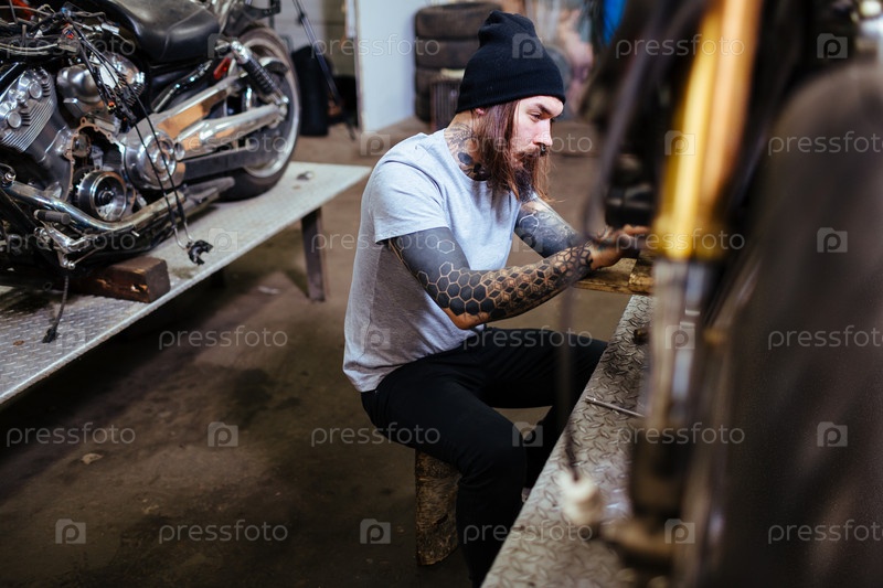 Татуированный механик собирает мотоцикл в гараже