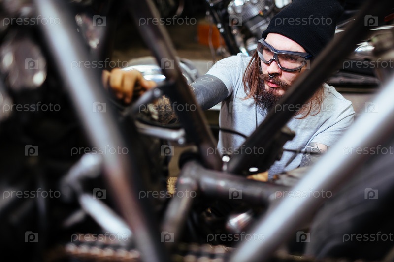 Байкер, собирающий мотоцикл в гараже
