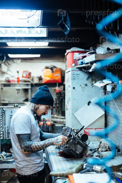 Механик с татуировкой в мастерской ремонта