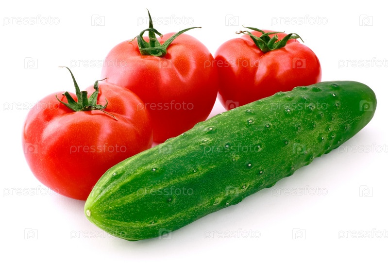 Три спелых томата и один огурец