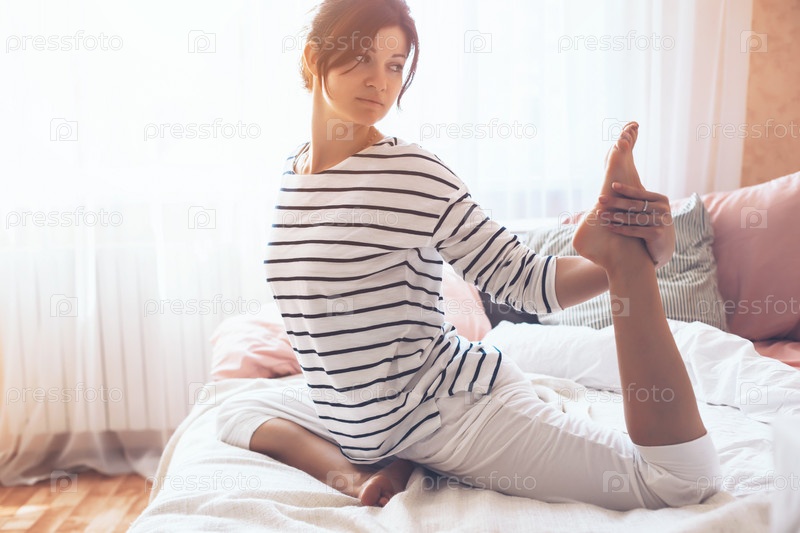 Женщина занимается йогой в постели
