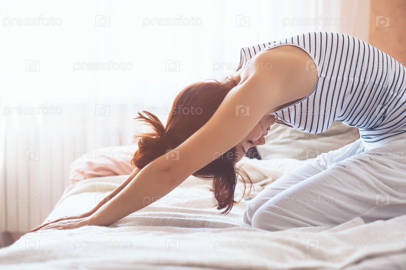 Женщина занимается йогой в постели