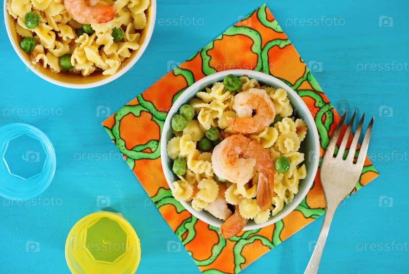 Салат из креветок с зеленым горошком и спагетти