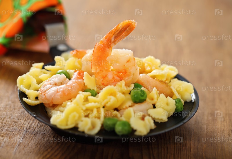 Салат из креветок с зеленым горошком и спагетти