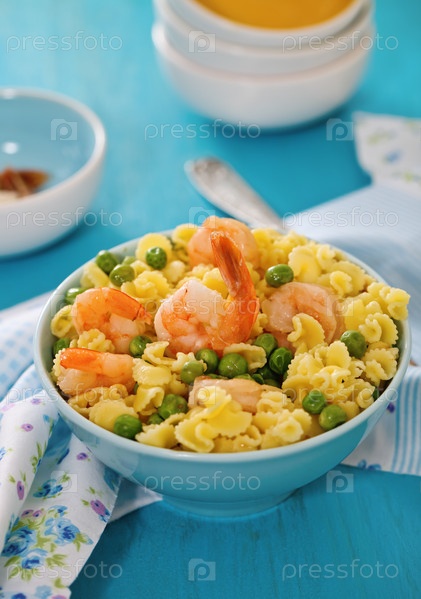 Салат из креветок с зеленым горошком и спагетти
