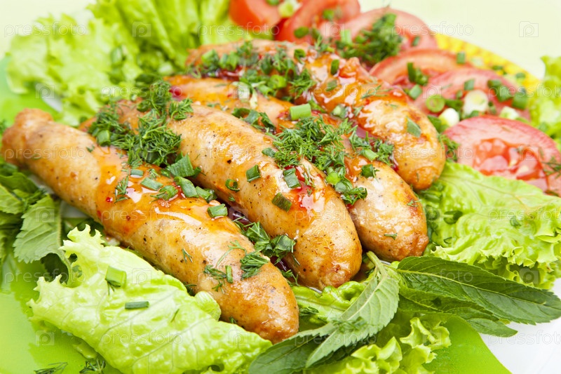 Жареные сосиски с овощами и зеленью