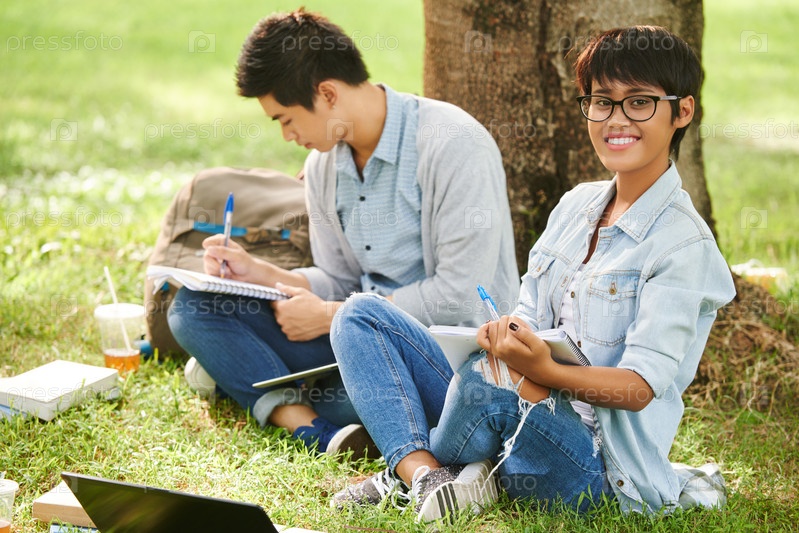 Стильный студент готовится к экзамену на открытом воздухе