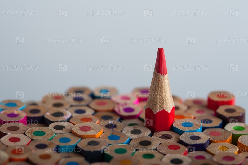Один заостренный красный карандаш среди группы карандашей