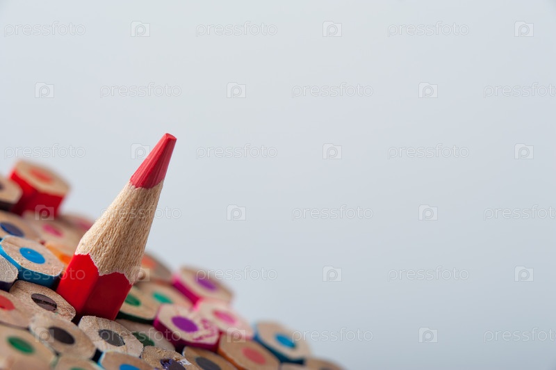 Один красный карандаш на фоне карандашей
