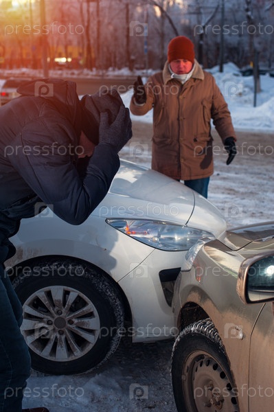 Двое расстроенных мужчин после автомобильной аварии на городской улице