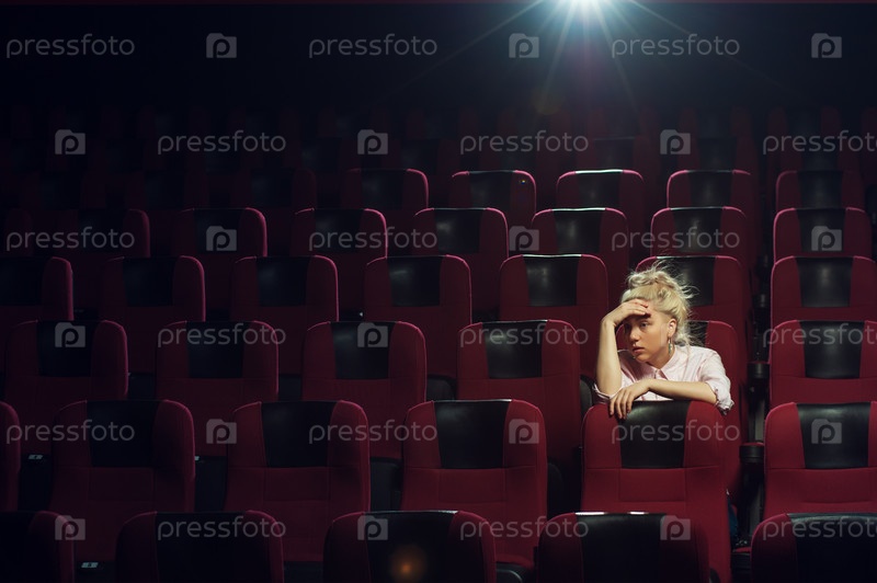 Симпатичная блондинка смотрит фильм в кинотеатре