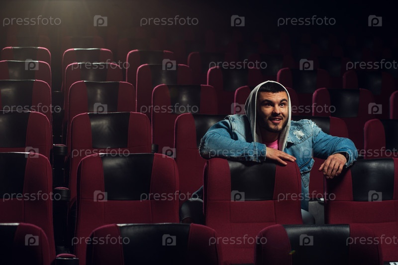 Счастливый возбужденный молодой человек, смотрит фильм в кинотеатре