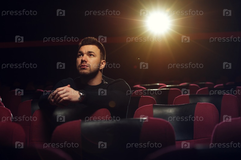Молодой человек задумчиво смотрит фильм в кинотеатре