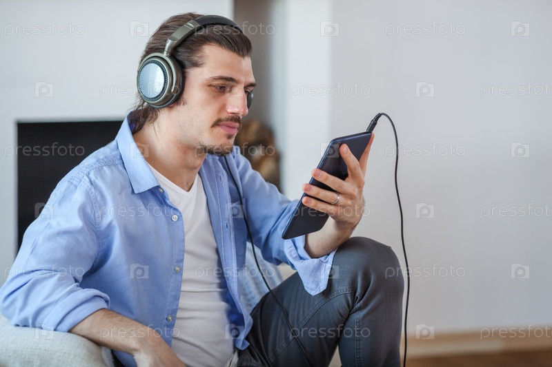 Красивый мужчина слушает музыку в наушниках