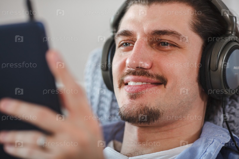 Красивый мужчина слушает музыку в наушниках