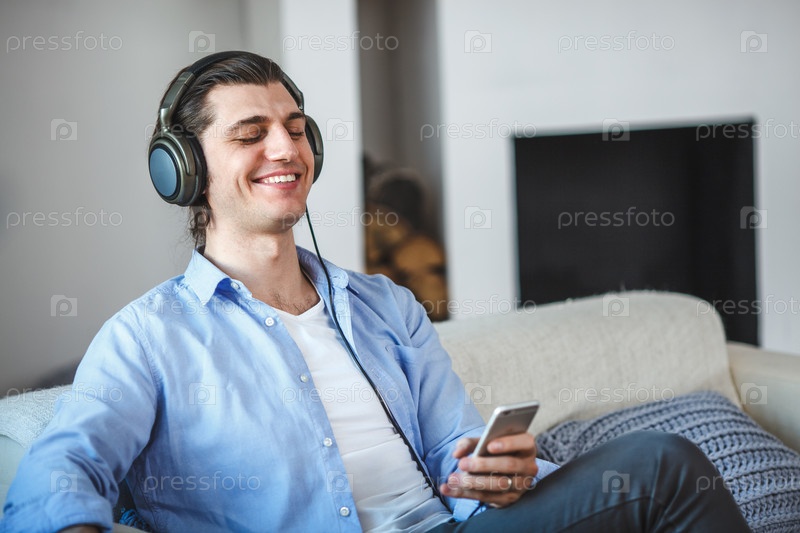 Красивый мужчина слушает музыку в наушниках
