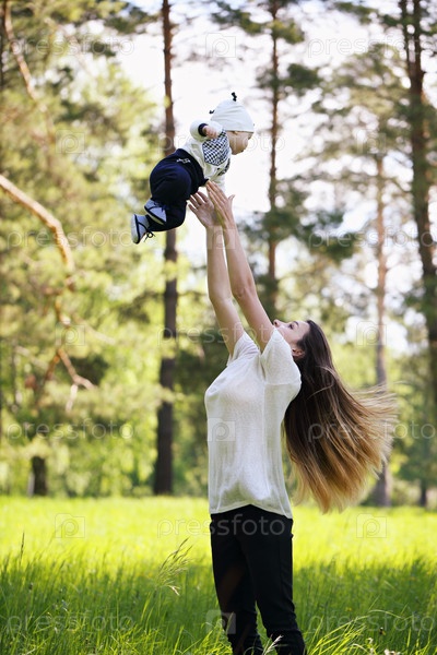 Счастливая мать подбрасывает своего сына