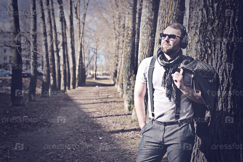 Мужчина в наушниках в парке