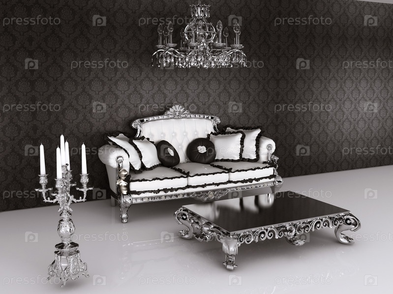 Королевская мебель, интерьер в стиле барокко. Диван с подушками и стол с канделябром