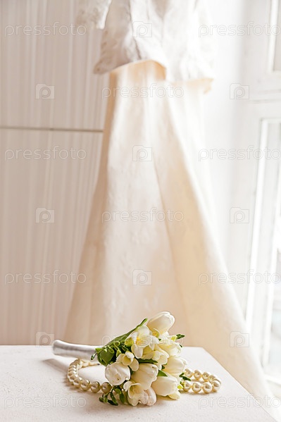 Свадебный букет с жемчужным ожерельем на фоне свадебного платья