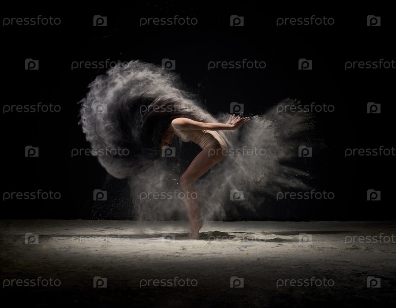 Танцовщица, движущаяся в облаке белой пыли в студии