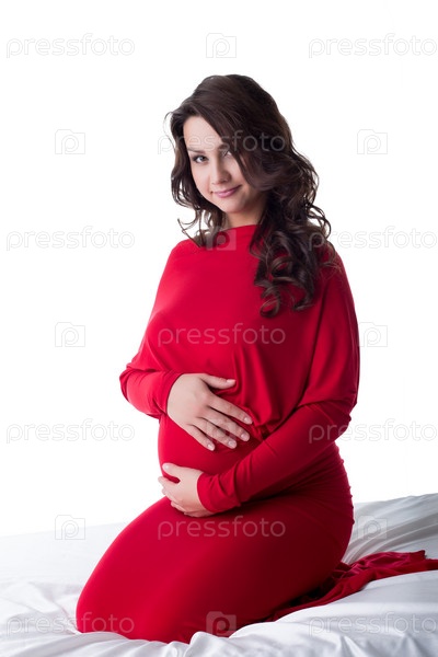 Беременная мать сидит на кровати