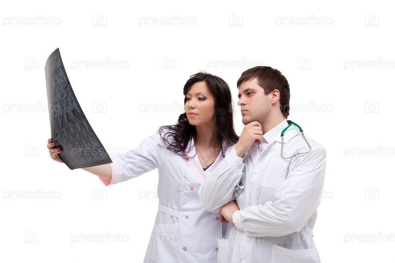 Сконцентрированные стажеры-медики смотрят на снимок рентгена