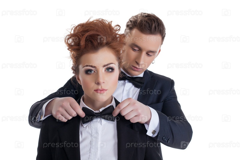 Галантный мужчина поправляет галстук своей сексуальной девушке