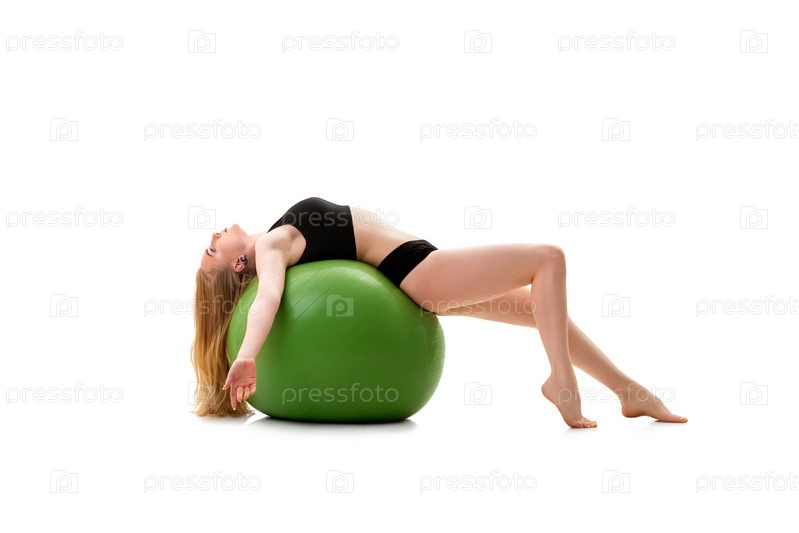 Блондинка в черных шортах и трусиках на зеленом большом фитболе