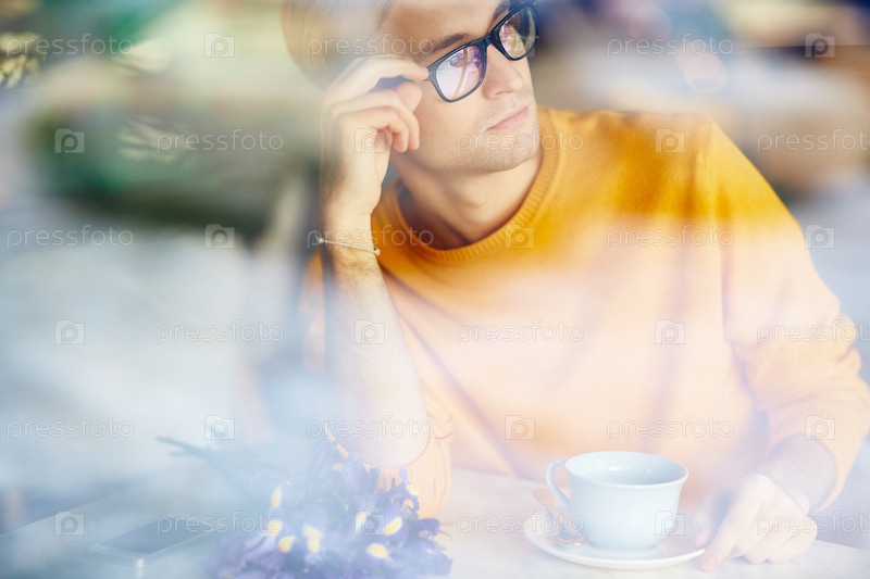Задумчивый молодой человек, глядя из окна кафе
