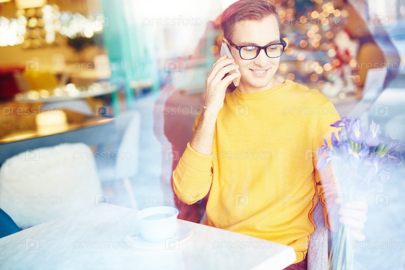 Улыбающийся молодой человек в ожидании встречи в кафе
